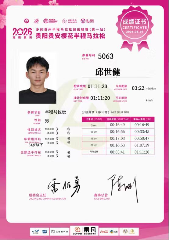 2026年3月29日,2026贵阳贵安樱花半程马拉松圆满落幕。我校学子邱世健以1小时11分23秒的枪声成绩,斩获半程马拉松男子组季军!